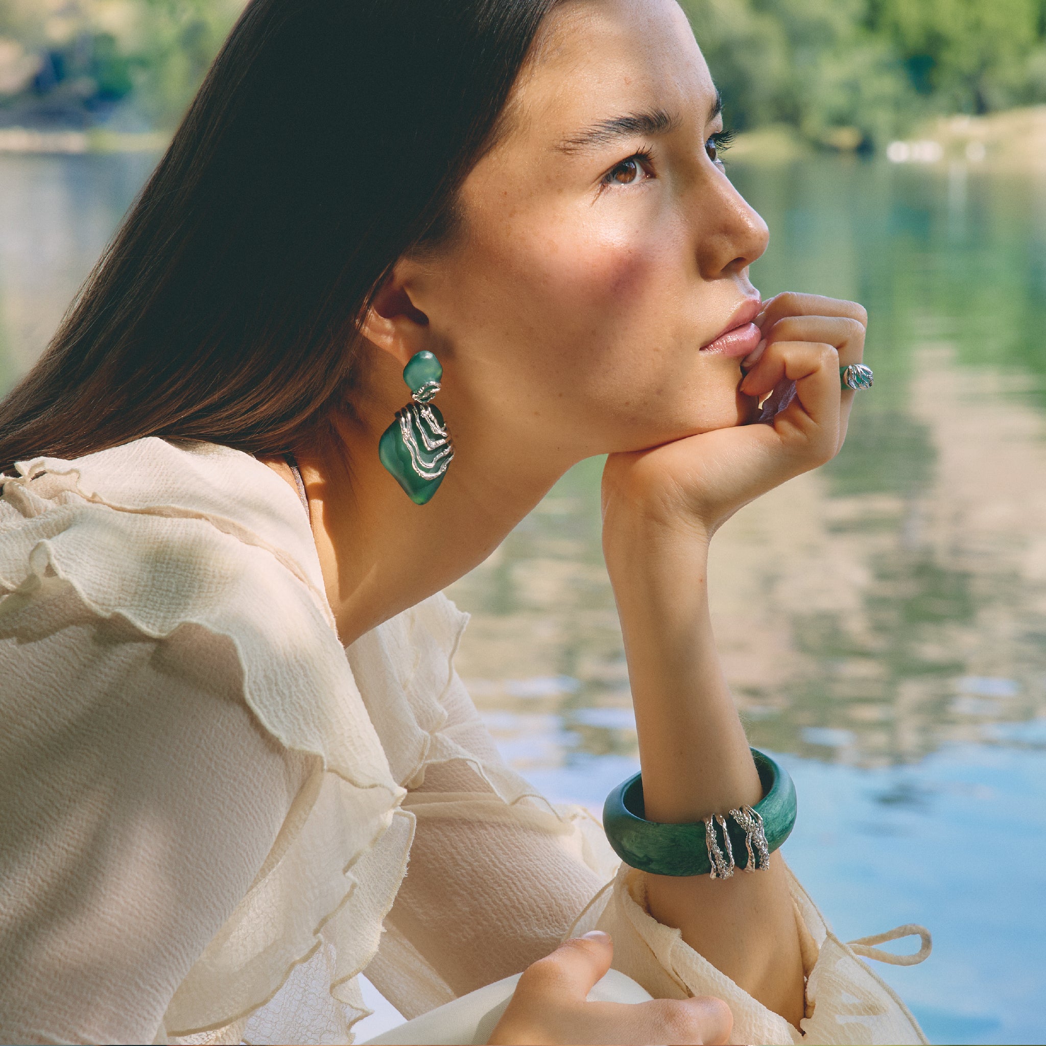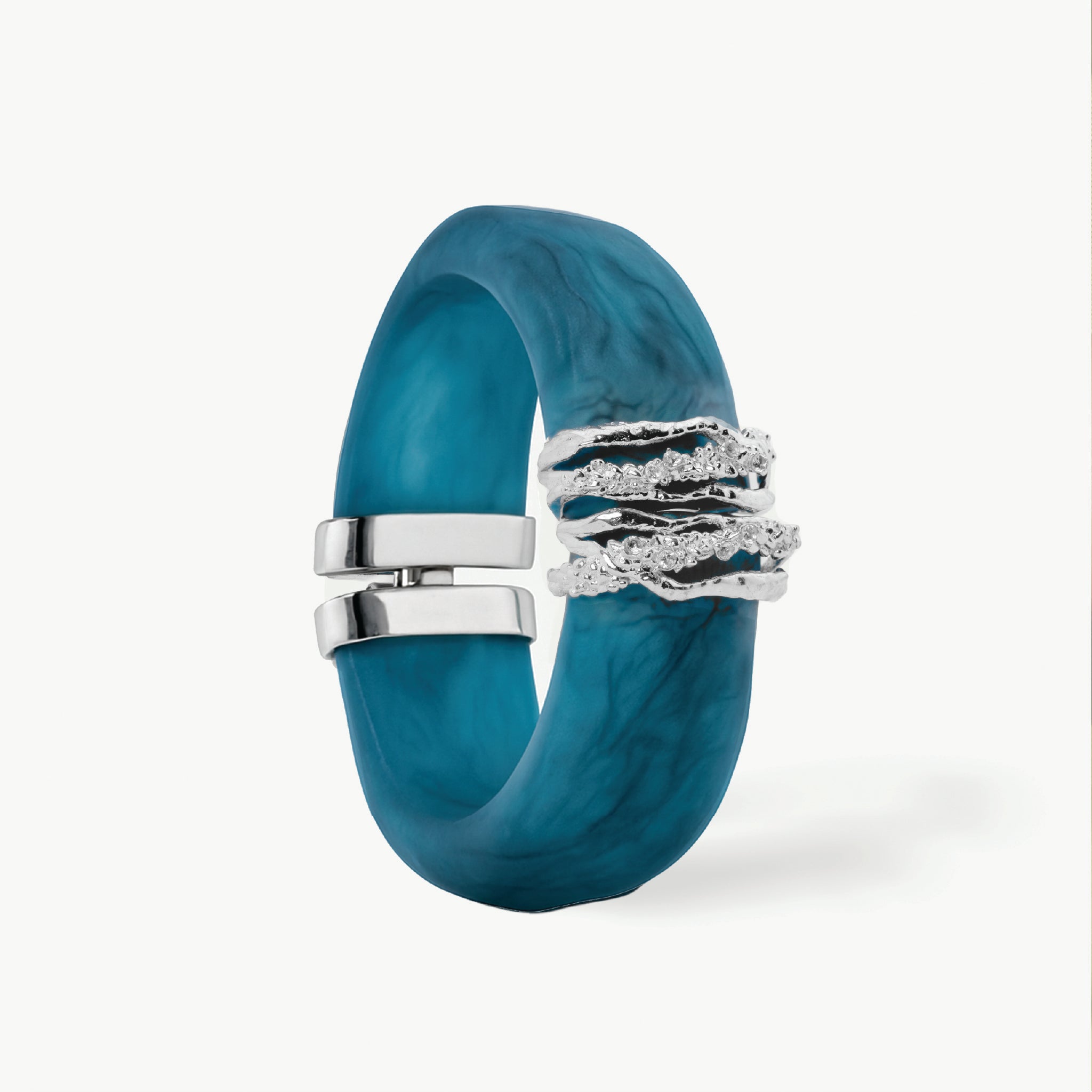 The Essence cuff captures your pure aura. This wide, smooth matte resin bangle embodies grounding strength, with its soft finish suggesting a deep, settled energy. The design features an intricate metal cage that envelops the resin, sparkling with crystal stones, symbolizing the vibrant, multifaceted essence that radiates from within.The bangle fastens with an integrated hinge and magnet closure, offering both security and ease.