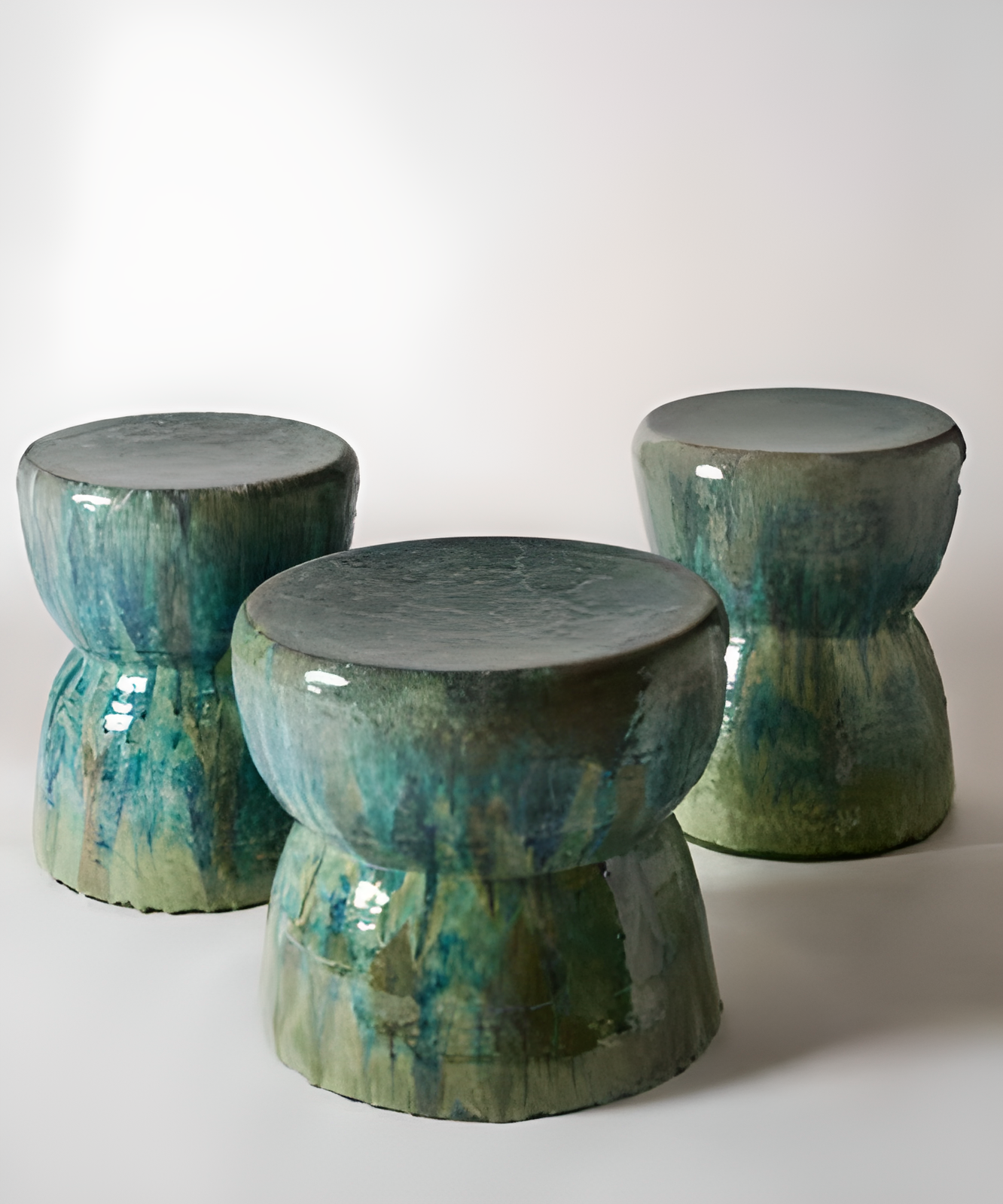 A sculptural yet functional set of stools and a side table, glazed in ocean tones that flow like water