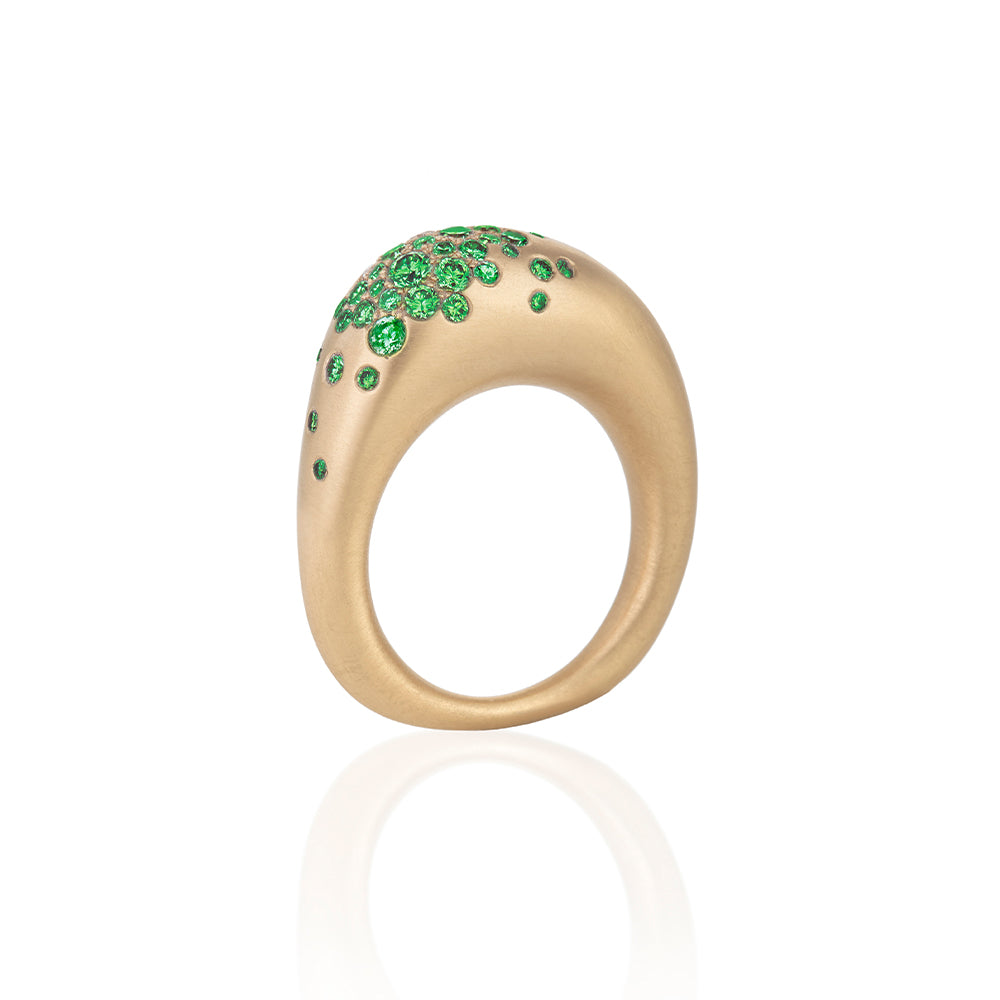 18K gold band with 1CT of tsavorite. Elegant, bold and full of emotional meaning depicting the designer's love for her city and Muse Beirut. Urban pieces represent Beirut's charming and colorful alleyways. The ring is available in different gem colors.