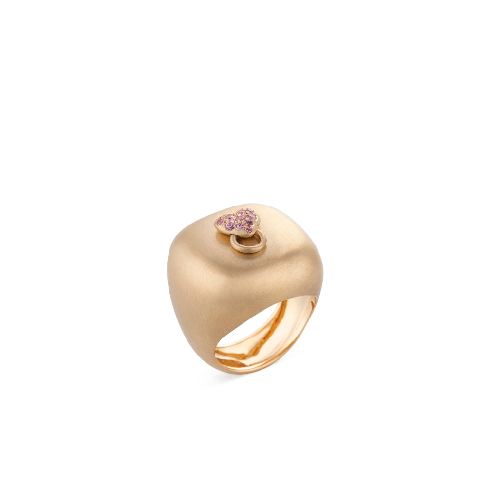 18K yellow gold ring and pinky ring with a heart shaped door knocker and 0.20CT of pink sapphire. Knock rings draw their inspiration from the magic and beauty of doors. The ring's door knocker is symbolic of knocking for self love.
