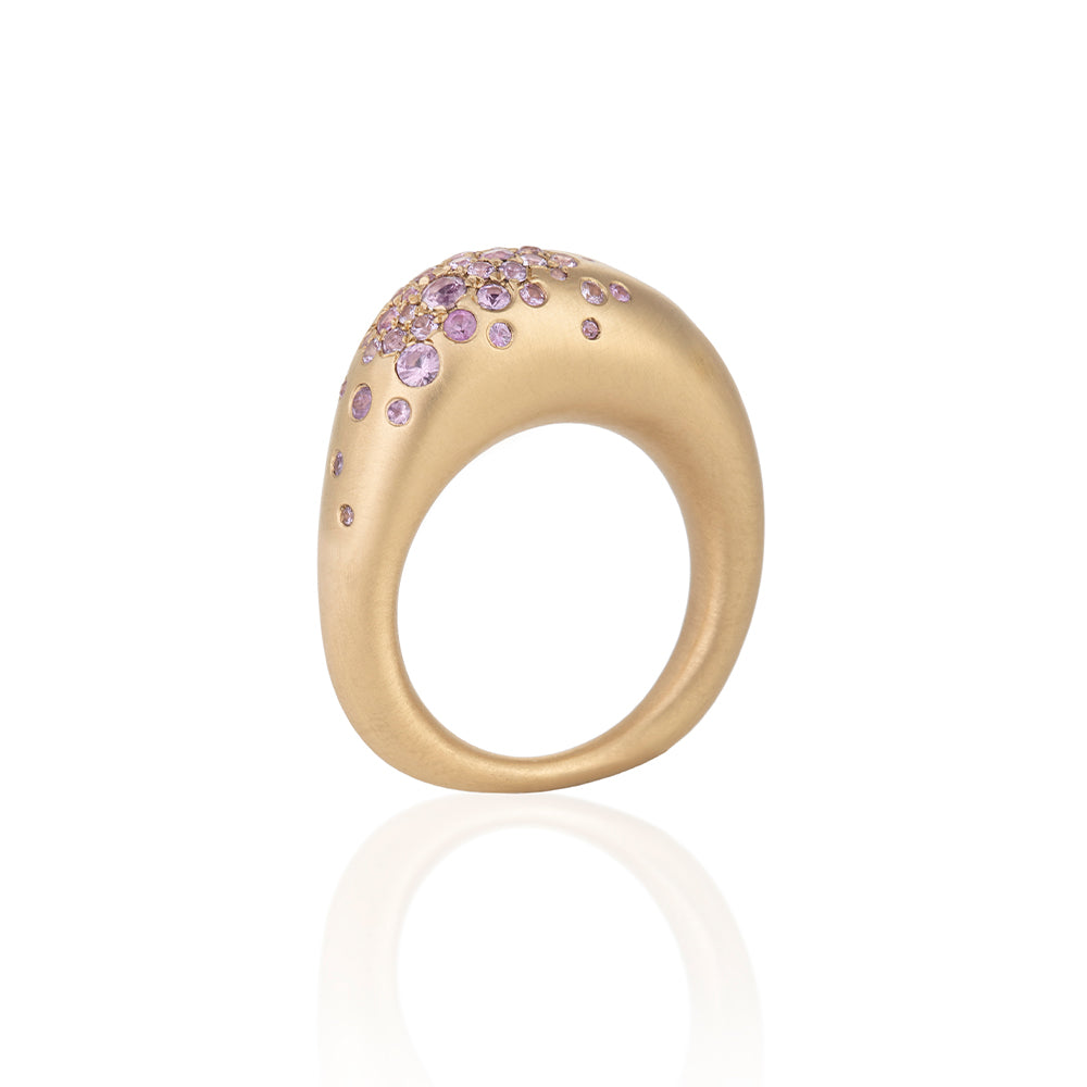 18K gold band with 1CT of pink sapphire. Elegant, bold and full of emotional meaning depicting the designer's love for her city and Muse Beirut. Urban pieces represent Beirut's charming and colorful alleyways. The ring is available in different gem colors.