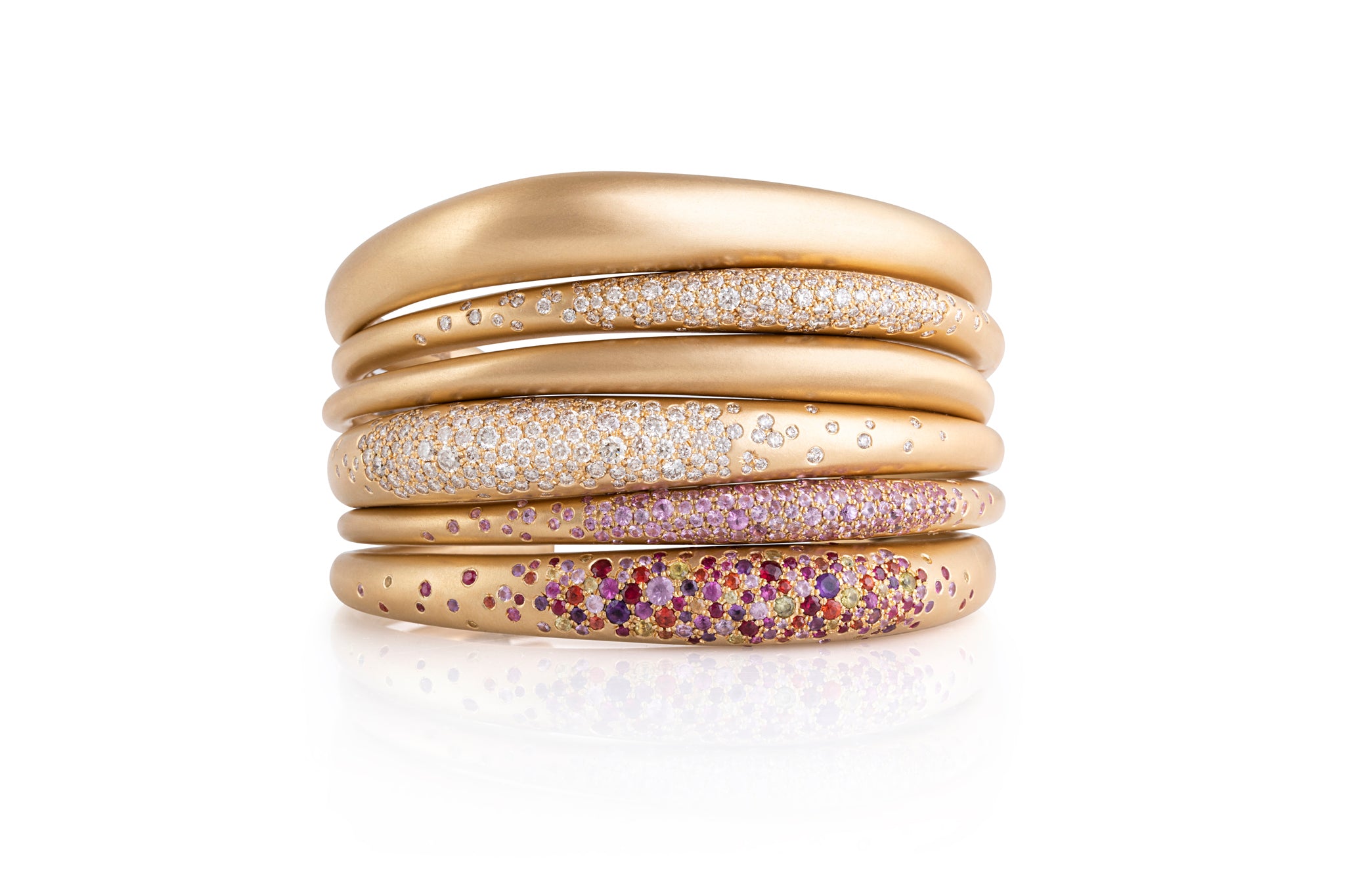 Nada Ghazal Fine Jewelry is more than adornment—it is asculptural expression of emotions, memories, and experiences. Each creation captures the designer’s personal moments, transformed into undulating waves of hand-brushed 18K gold, contrasted with intricately set pavé diamonds and precious gems.
