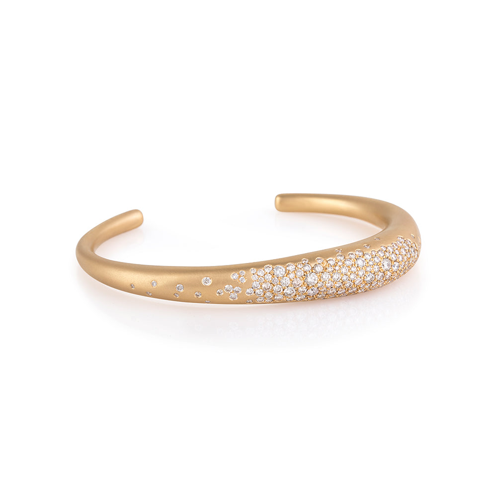 18K gold cuff with 2.50CT of champagne diamond. Urban pieces depict Beirut's non-uniform, cobblestoned alleyways, their charm and their colors. The cuff is available in thin and thick variants and in different precious stones.