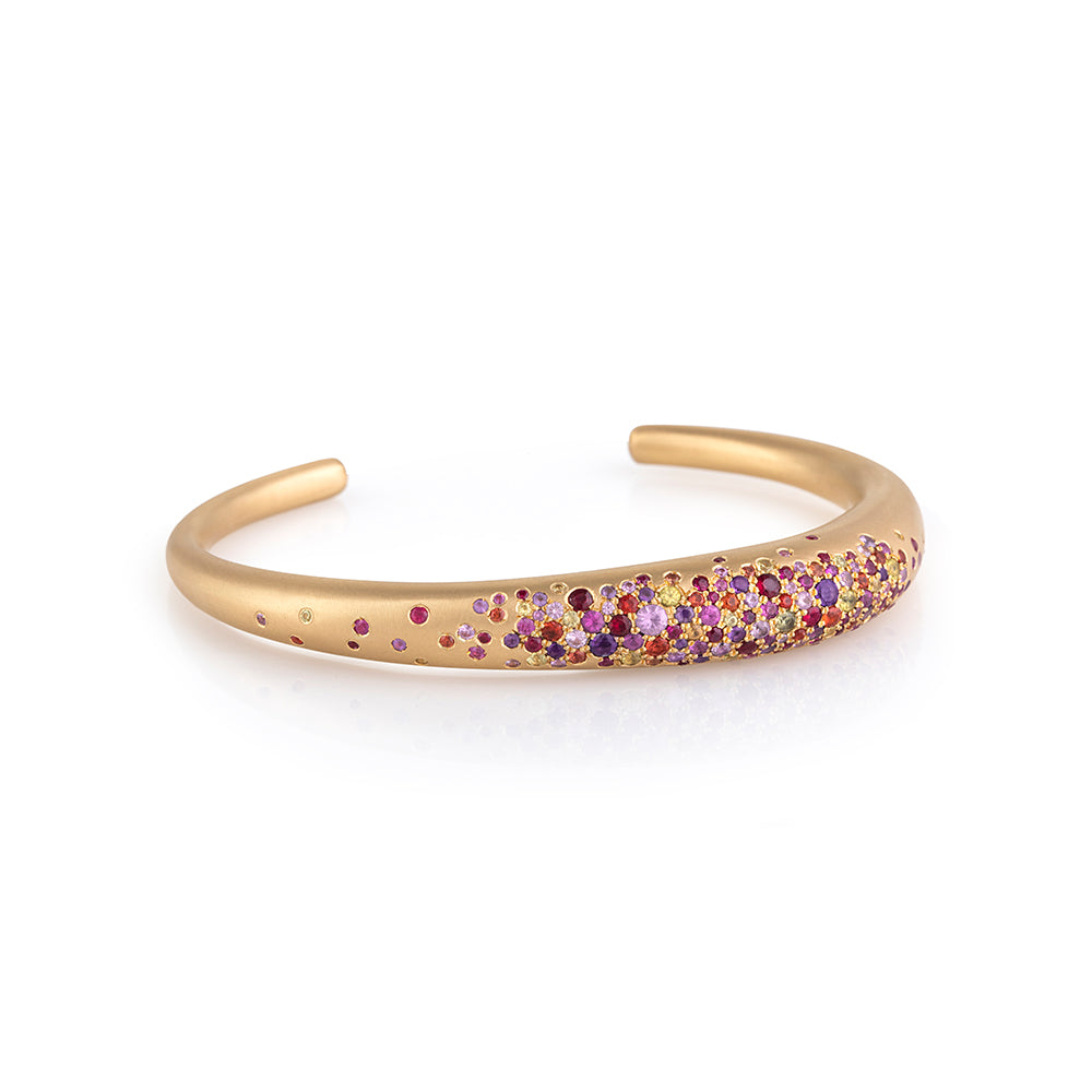 18K gold cuff with 2.80CT of multicolored sapphire. Multi sapphire colors represent sunsets and summer night hues in Nada's home city and muse, Beirut. Each cuff is unique as no two are set in the same manner.