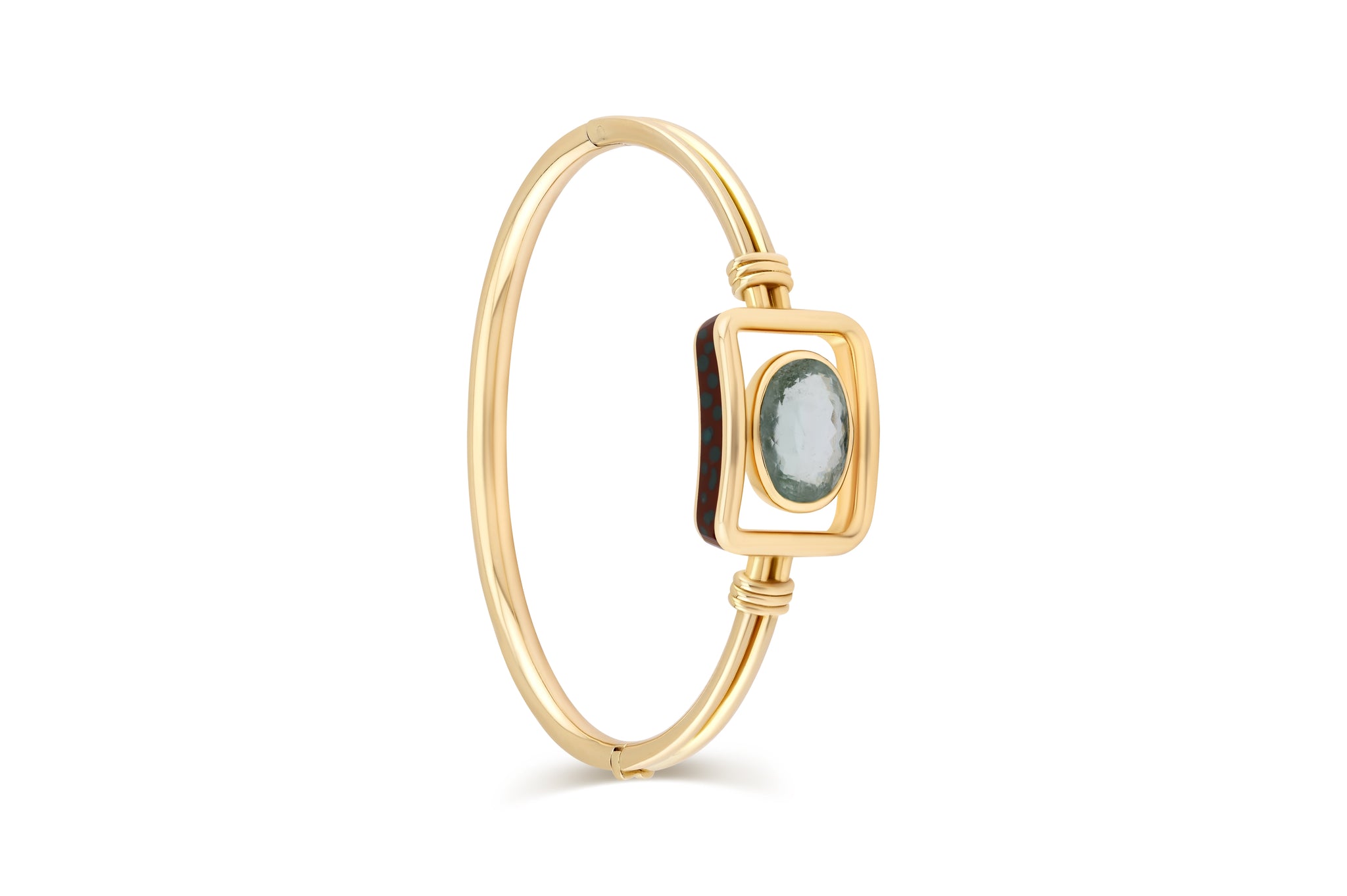 A refined cuff bracelet centered with an Oval-cut 6.20 ct Paraiba Tourmlaline, bezel-set within a sculptural open gold frame. Hand-applied enamel detailing traces the inner arc, adding a quiet rhythm of color against the warmth of 18K Yellow Gold.