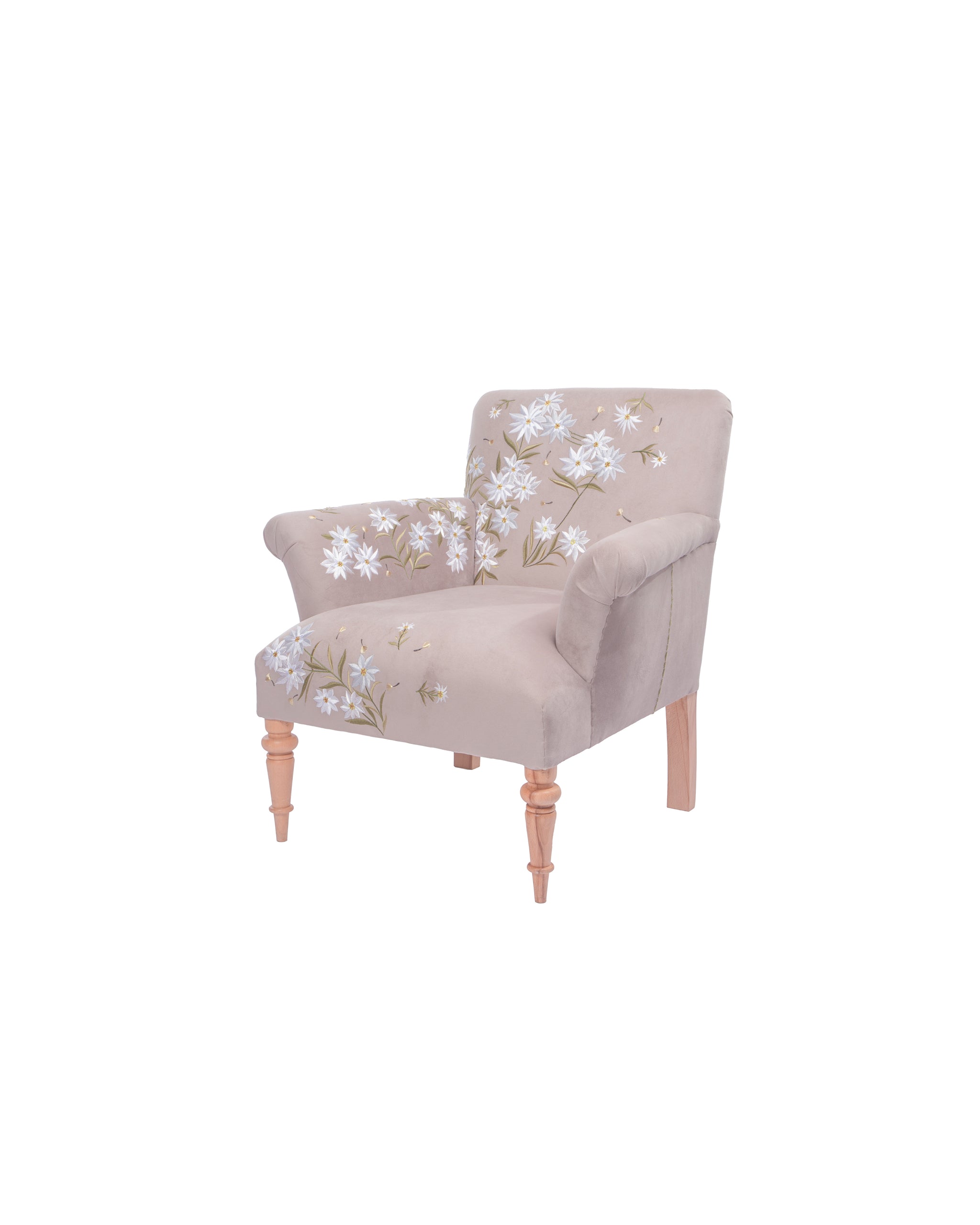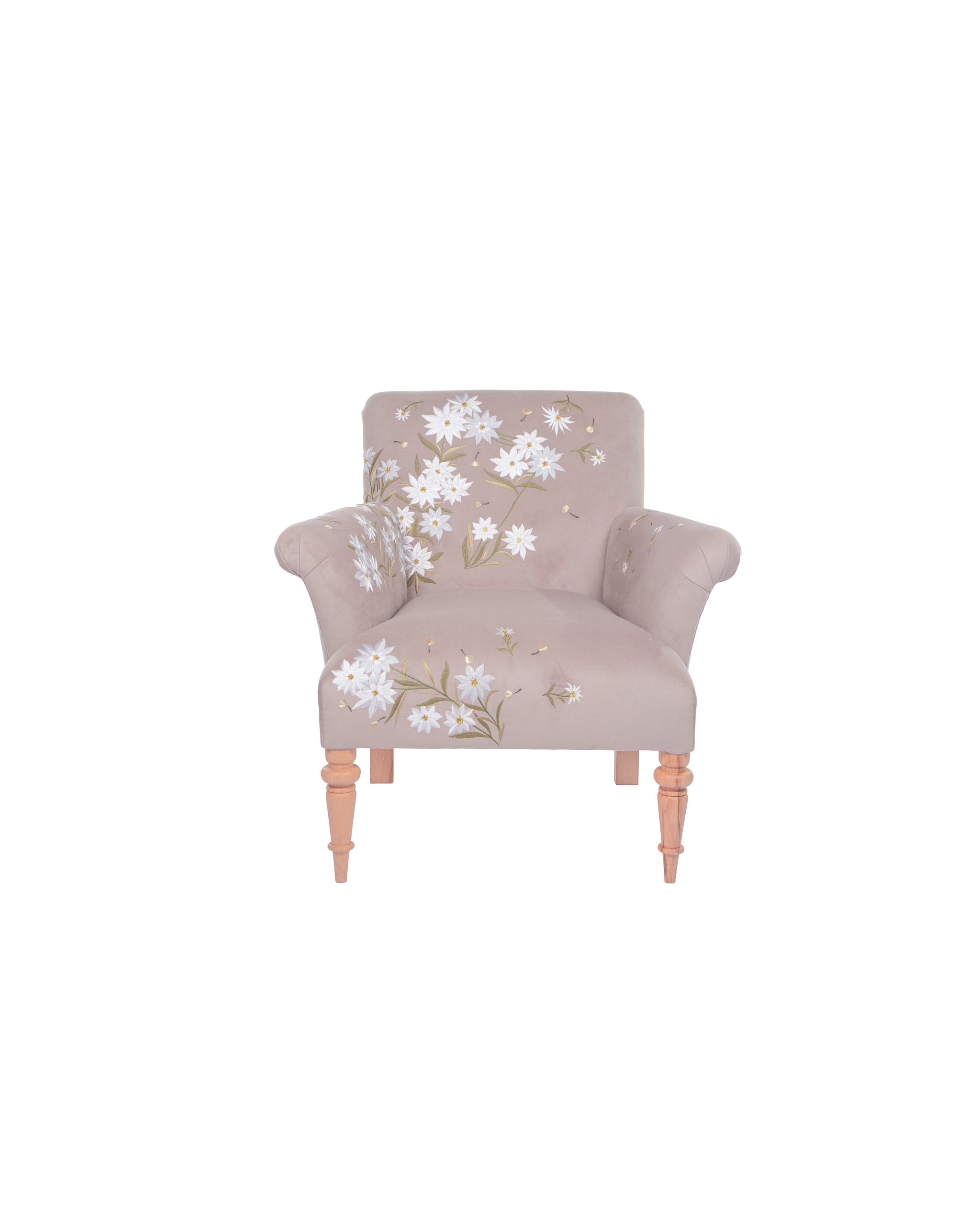 Comfortably rest your tired arms on the rounded cushioned surface of our Kirgis armchair. With a generous seat worth diving into, this elegant piece stands tall on its wooden legs. In noble white, these Edelweiss flowers bloom in their most festive regalia, competing for the bees’ attention.