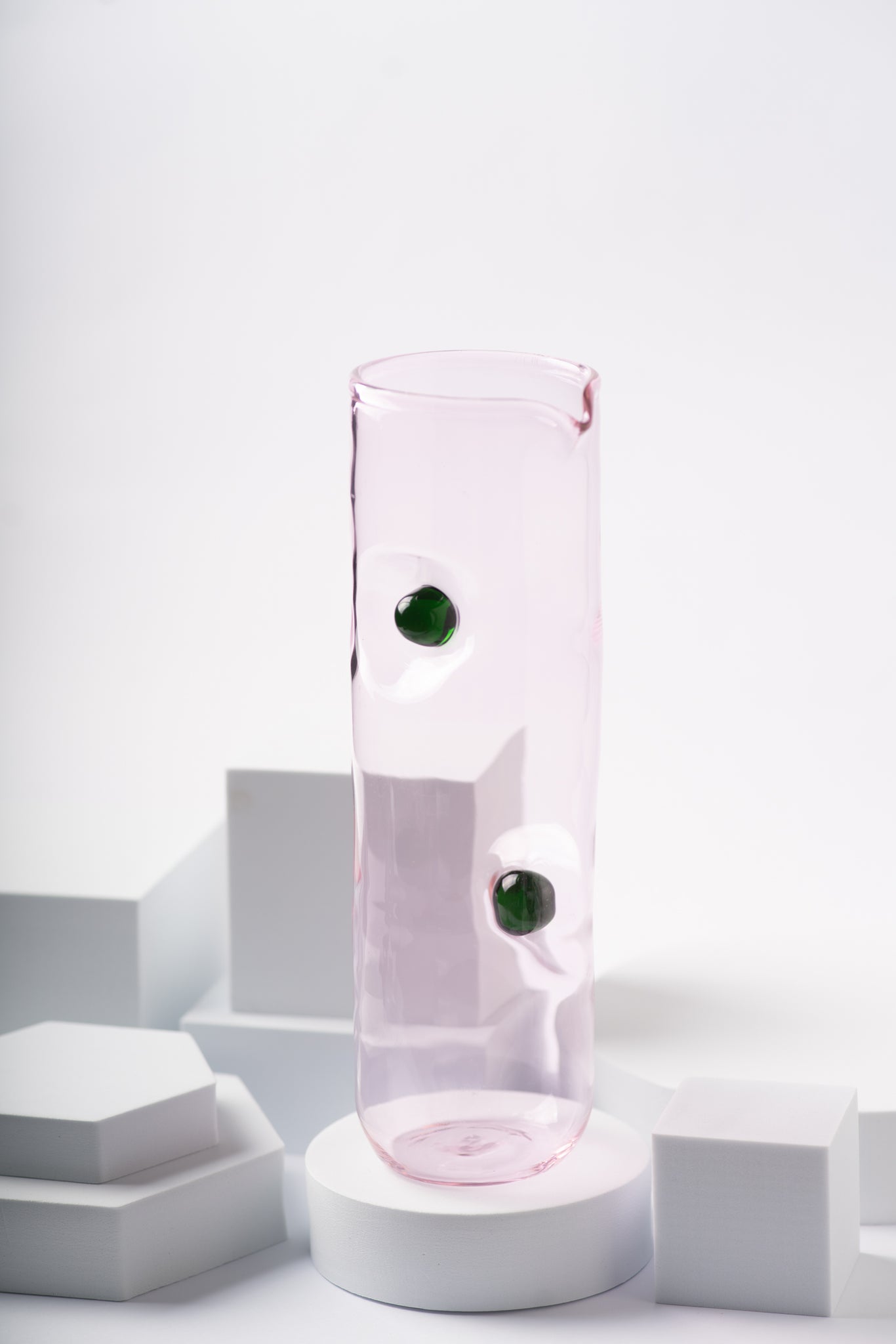 Imagine serving your favorite beverages from this piece, or perhaps displaying it as a striking vase. The sleek, elongated glass body is enhanced by two perfectly placed circular forms, creating a visual playfulness that adds an element of whimsy to its refined body. These forms a highlight the extraordinary craftsmanship behind the piece, showcasing the skill and precision of our glassblowers.