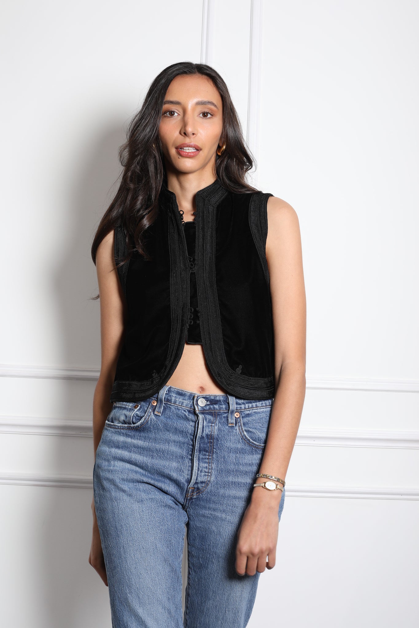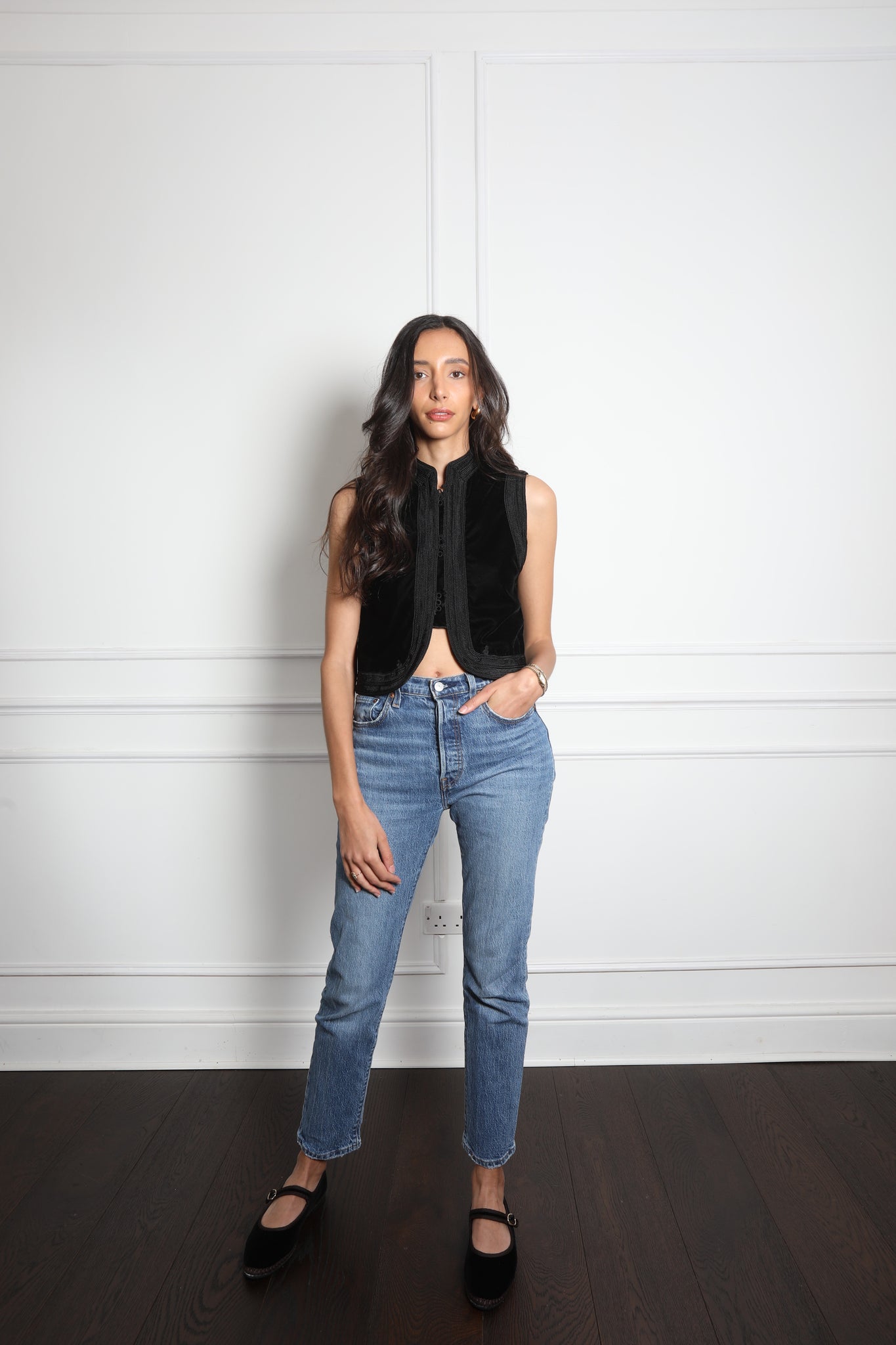 Introducing “La City,” a chic black velvet gilet that blends modern tailoring with refined craftsmanship. This elegant piece features intricate silk embroidery contouring the edges, adding a sophisticated touch of detail. Designed with a fitted cut and shorter length, it offers versatile styling—wear it on its own for a sleek, contemporary look or layer it over a crisp white shirt for a polished, professional outfit. Named after London’s iconic financial district, “La City” transitions effortlessly from stylish workwear to a statement piece for any occasion.