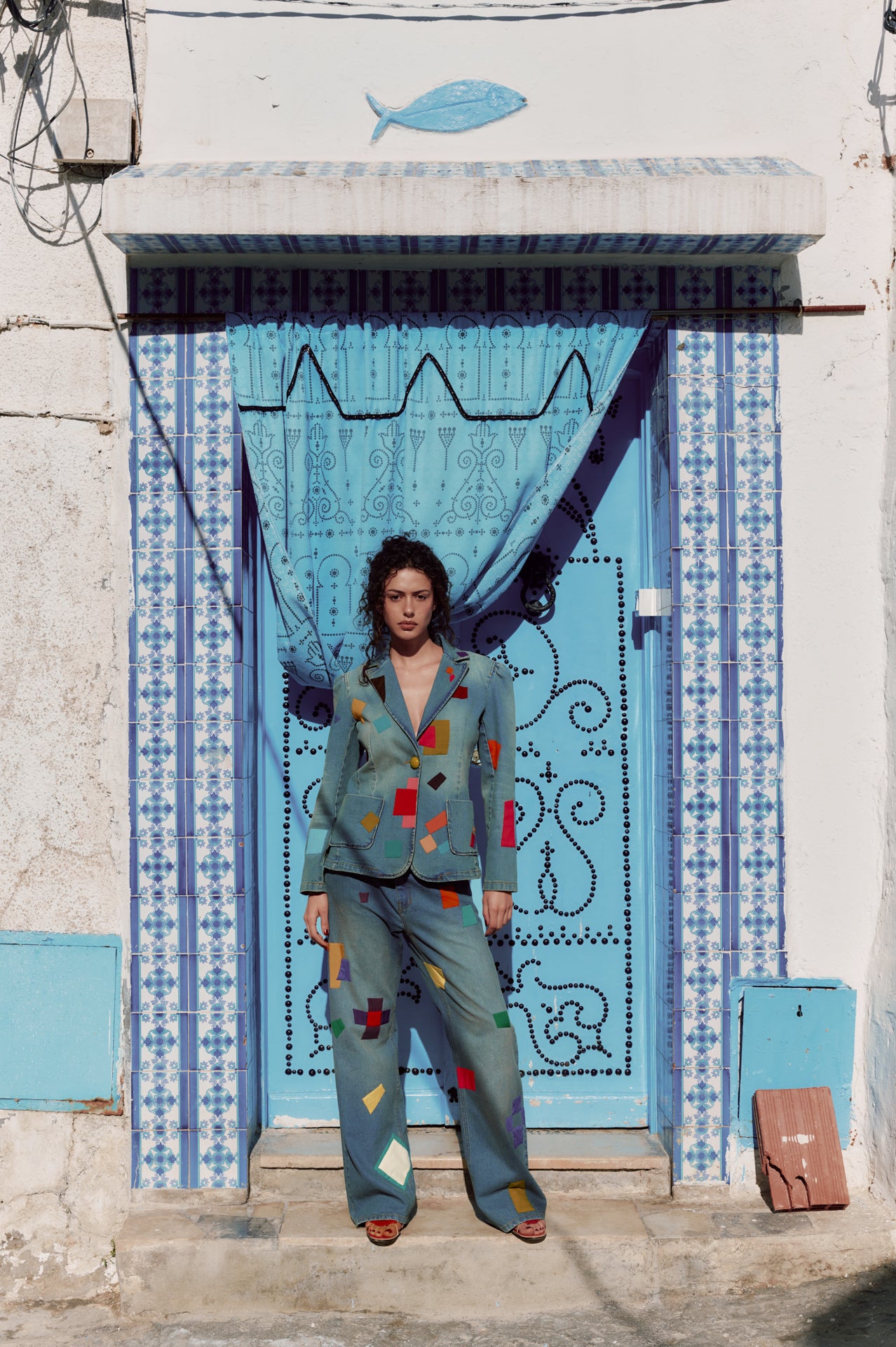 The ELLS jeans are made from light-wash denim and feature contrast fabric appliqué shapes placed across the front and back legs. Each appliqué is individually cut and stitched, resulting in unique placement on every pair. The jeans are finished with a classic five-pocket construction and a low waisted, straight-leg silhouette.