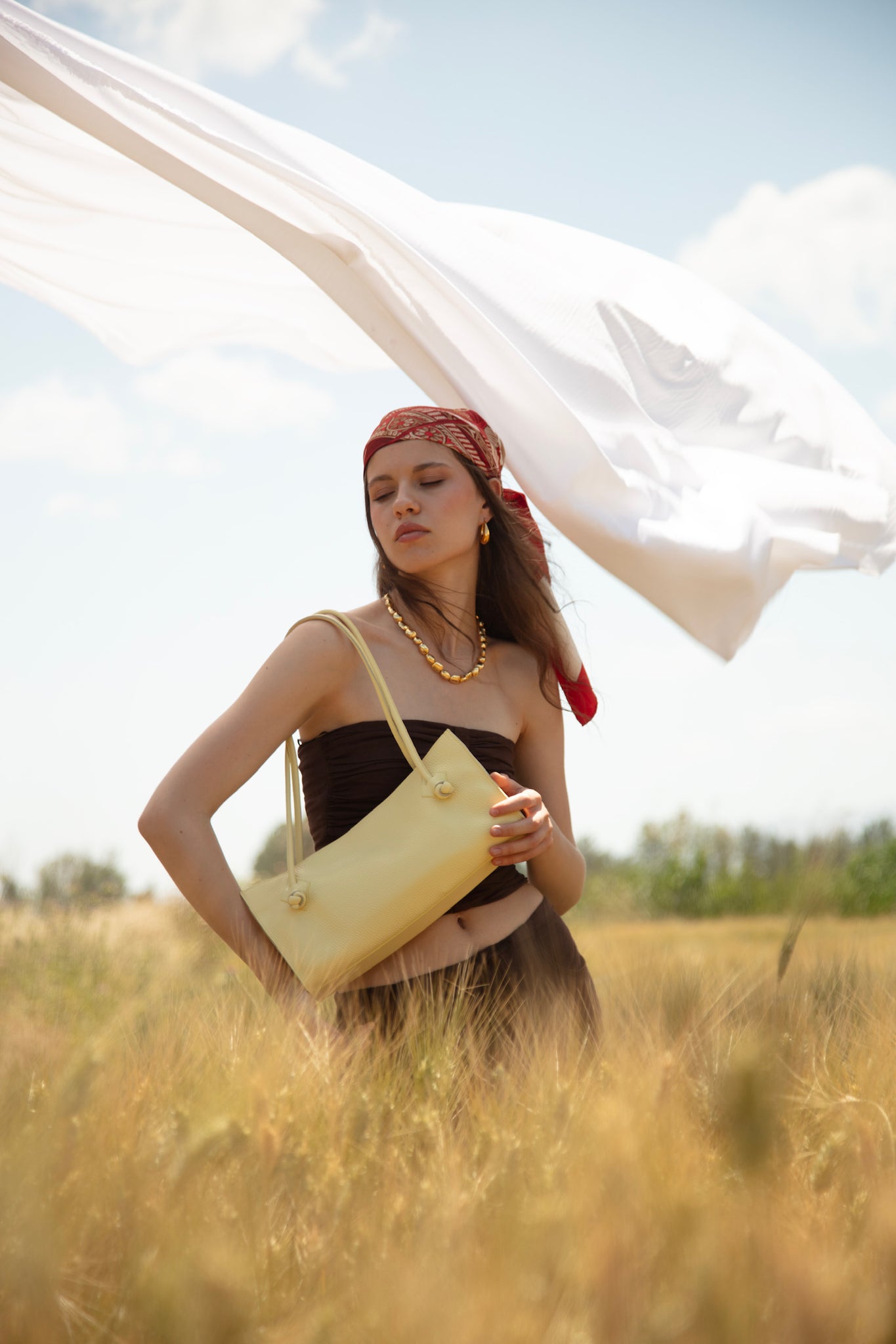 The Ter East-West Bag is a slimline, horizontally proportioned evolution of the original Ter silhouette. Its elongated shape is defined by clean lines, dramatic drop handles, and a soft,