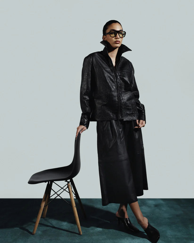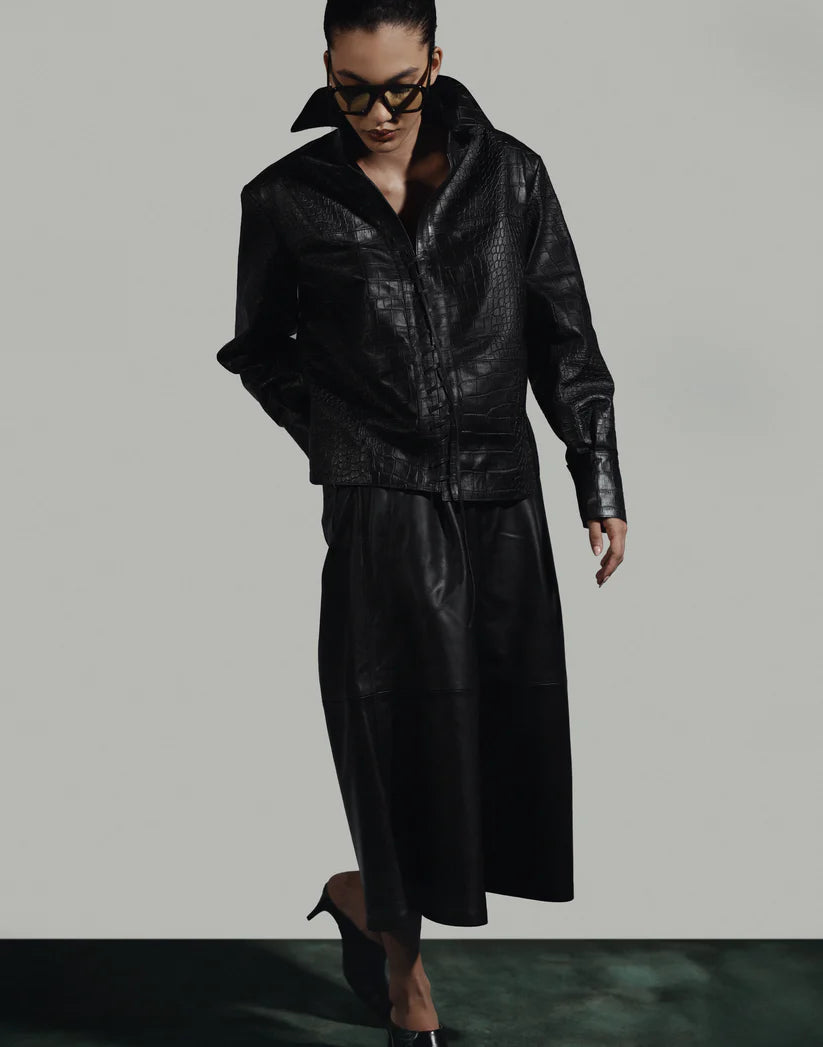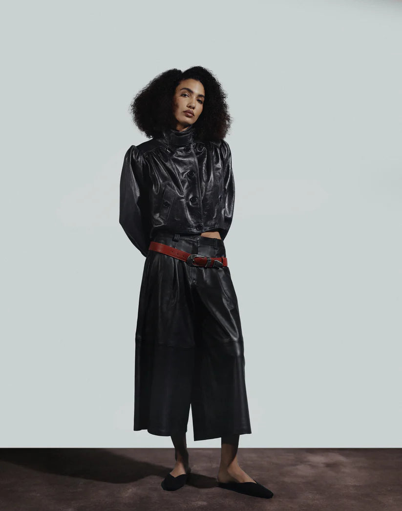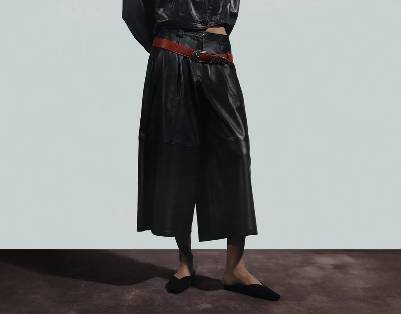 Step into a new era of cool with these cropped-length leather pants, where minimal design meets bold attitude. Featuring a sleek front zip and button fastening for a secure fit, these pants blend functionality with effortless style.