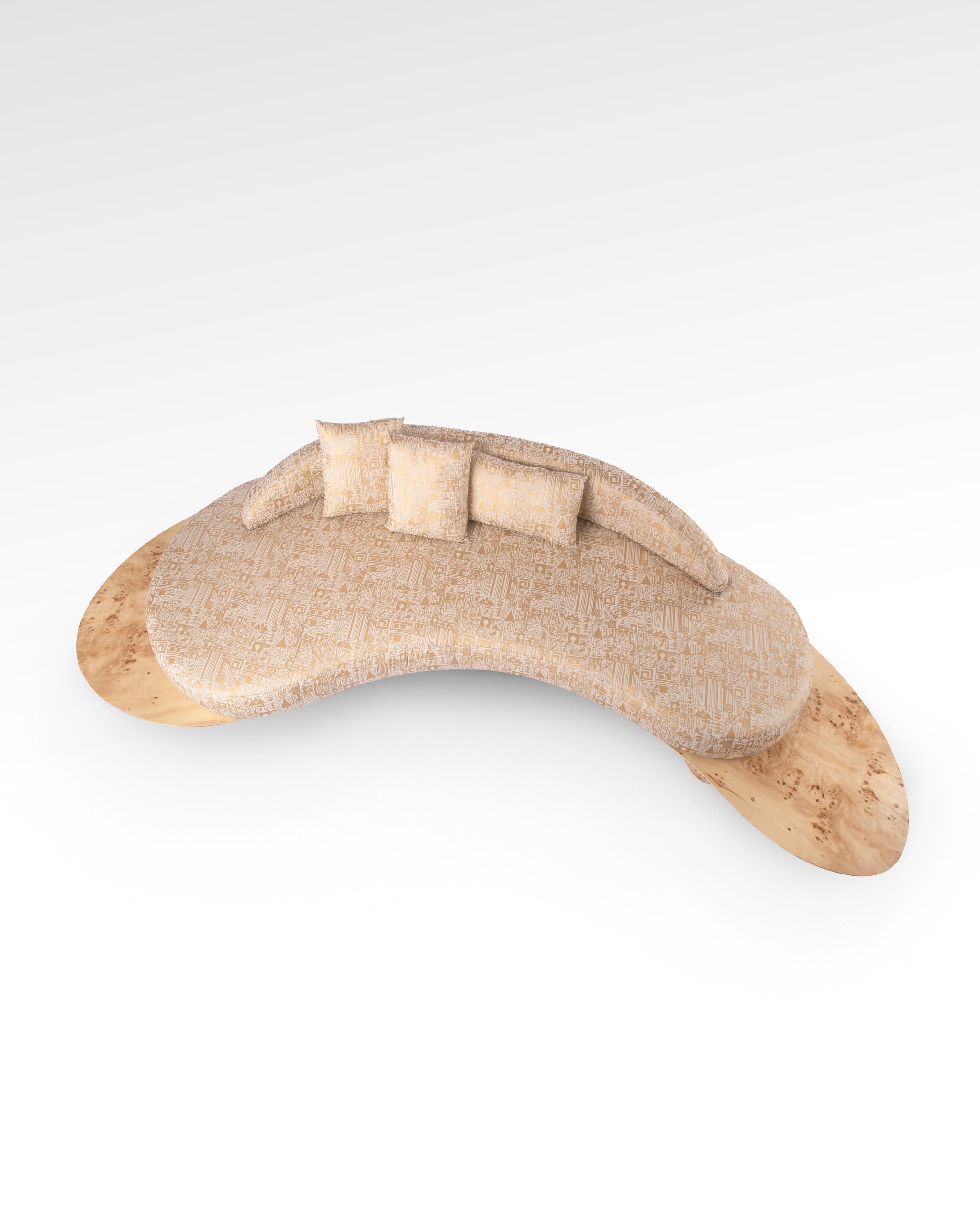 To eternity and beyond on contemporary one-of-a-kind design. This organic shaped sofa curves invitingly like welcoming arms ushering you to sit and relax. The apple rind base extends on either side of the sofa for a cascading effect nestled on three tree-trunk shaped legs. All crowned with shimmering gold Pharaonic pattern upholstery for a royal touch reminiscent of an era of refined luxury.