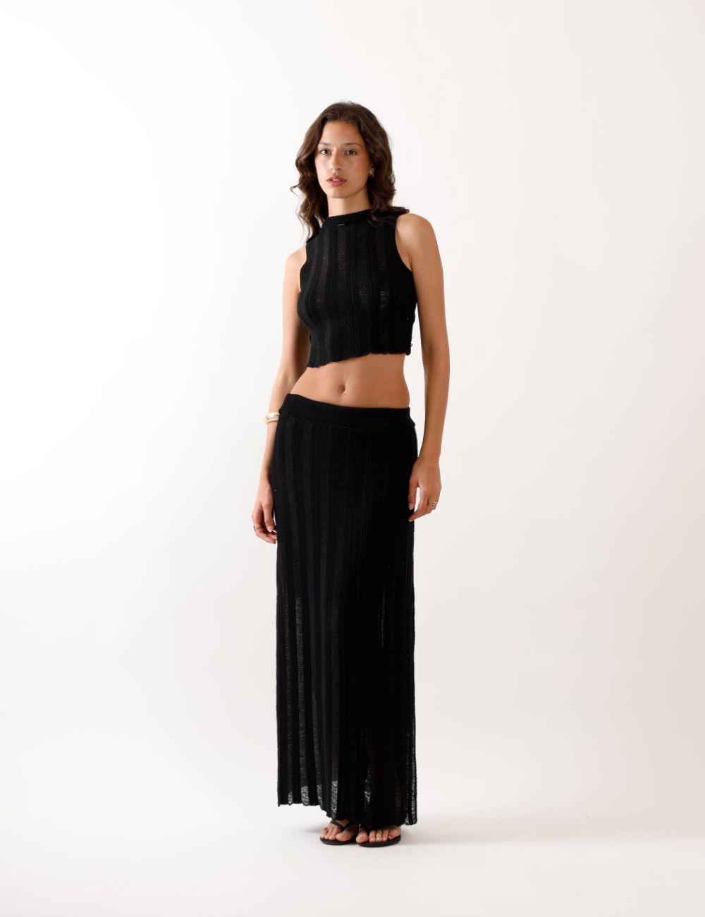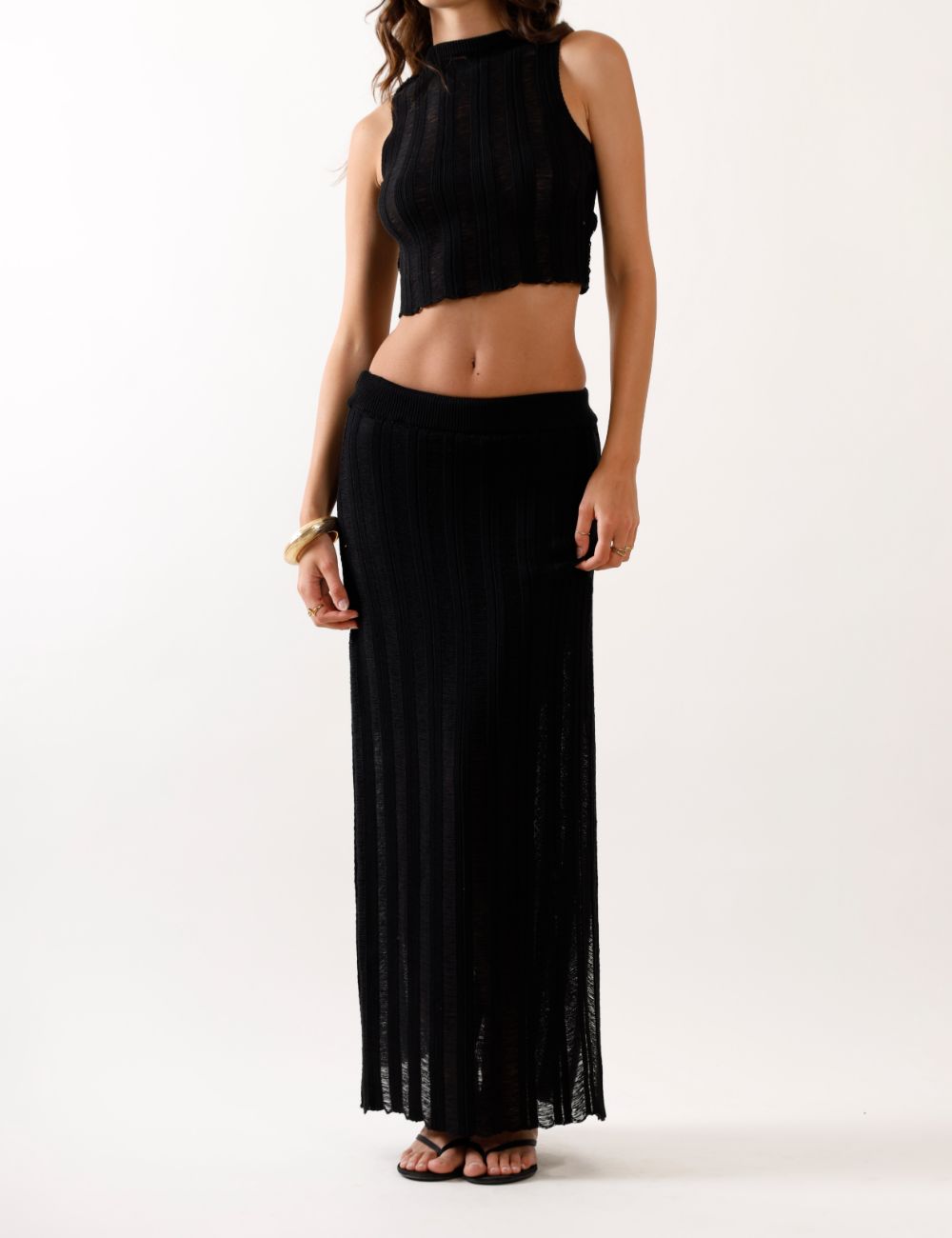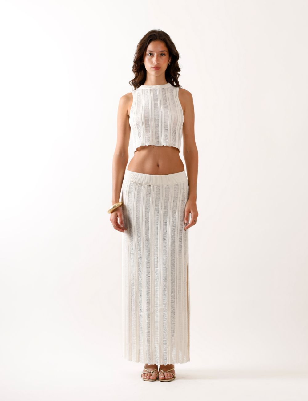 Make a statement in this two-piece knit set, featuring a sleeveless cropped top and matching mid-waisted maxi skirt. Designed in a ladder-stitch knit with a tassel-like texture, the semi-sheer finish adds a sultry, breathable elegance perfect for warm-weather days and coastal evenings