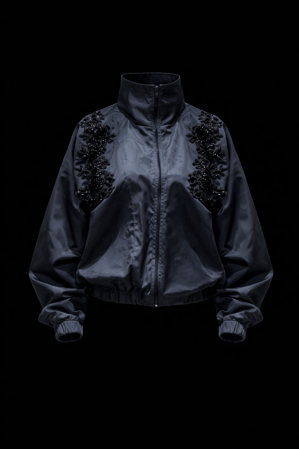 Introducing the Dazzled Track jacket, crafted from lightweight yet durable polyester, the jacket offers a smooth, shiny finish with a soft drape that moves effortlessly with the body. The high neckline/collar, embroidery, and relaxed sleeves enhance the modern, editorial feel, while the oversized fit allows for easy layering and styling versatility.