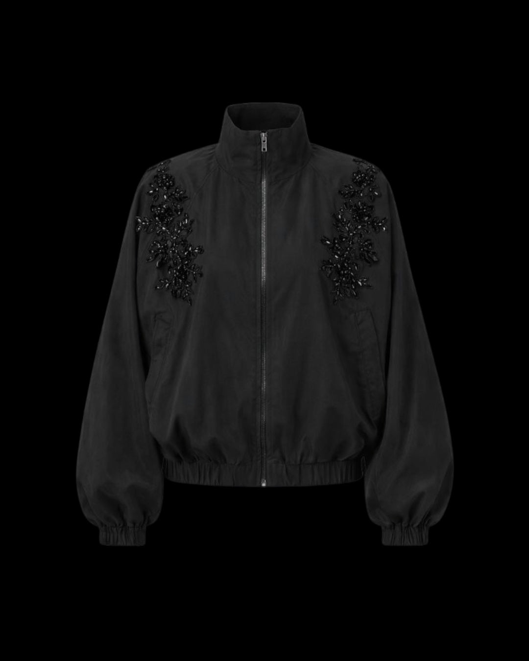 Introducing the Dazzled Track jacket, crafted from lightweight yet durable polyester, the jacket offers a smooth, shiny finish with a soft drape that moves effortlessly with the body. The high neckline/collar, embroidery, and relaxed sleeves enhance the modern, editorial feel, while the oversized fit allows for easy layering and styling versatility.