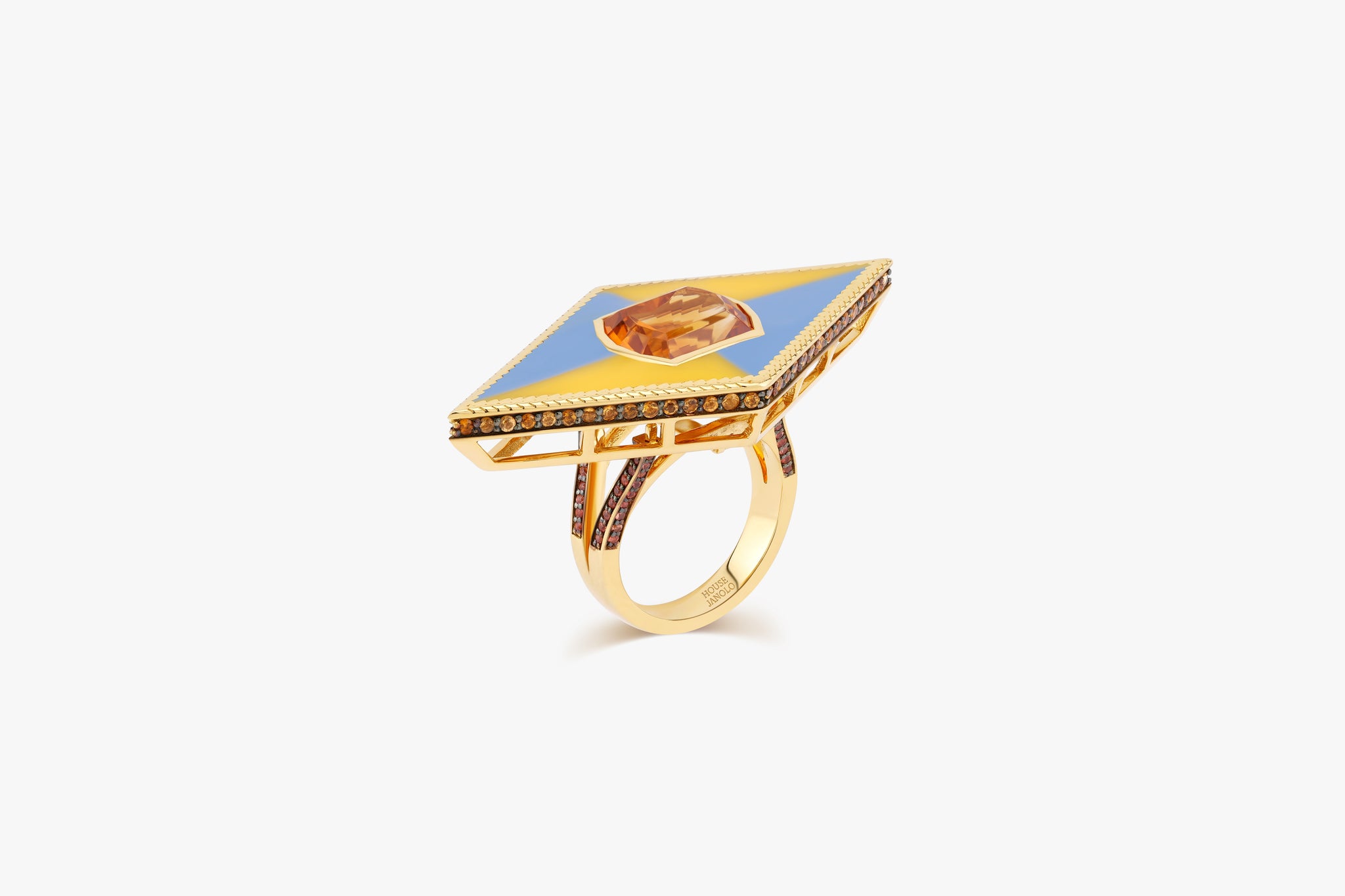 Marquise-shaped statement ring featuring a 5.04ct Emerald-cut Citrine as the center stone, accented with 1.41 ct of Orange Sapphires, all bezel-set within a hand-applied enamel field in 18K Yellow Gold. Item conceived as convertible piece—the band is detachable, allowing the design to transform seamlessly into a pendant.