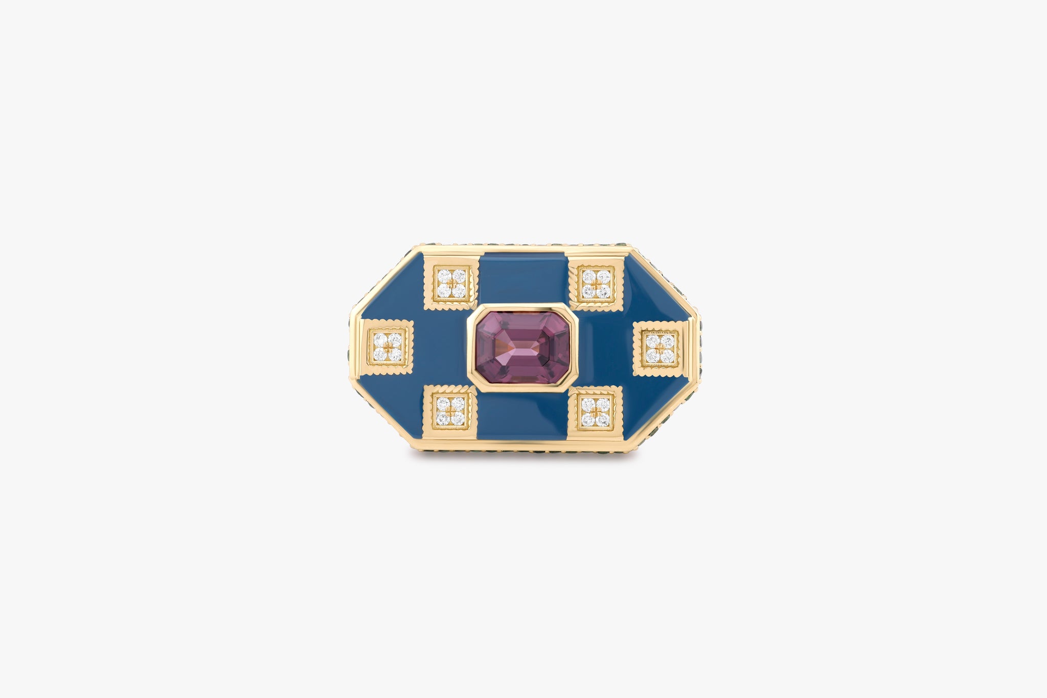An Octagonal statement ring centered with a bexel-set 3.32ct Emerald-cut Spinel centerstone, accented with 0.27ct of Diamonds in a flush setting and 1.01ct of Tsavorite with hand-painted enamel on a band in 18K Yellow Gold.